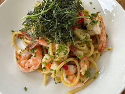 Tagliatelle s vepřovou panenkou s hráškovým pestem a parmazánem