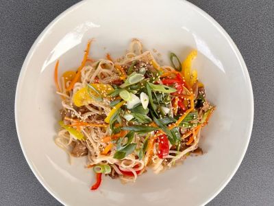 Tagliatelle s vepřovou panenkou s hráškovým pestem a parmazánem