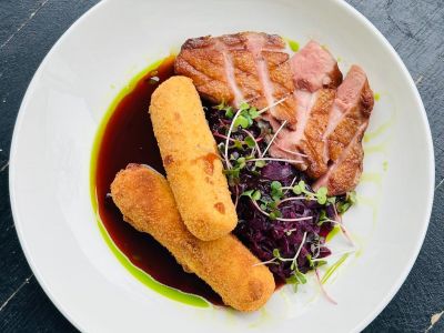 Konfitované kachní stehno, červené malinové zelí, domácí bramborové špalíčky