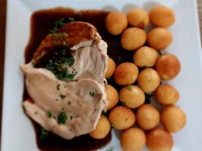 200g Steak z vepřové pečeně s omáčkou z hrubozrnné hořčice a americkými bramborami