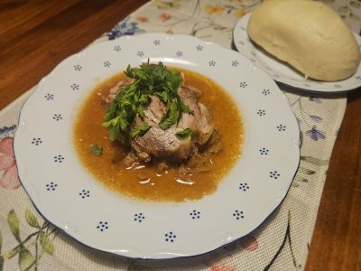 Pečené králičí stehno na smetaně, knedlík
