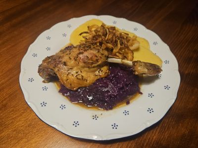 Pečené kuřecí stehno, červené zelí, knedlík, bramborový knedlík