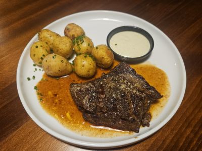 Olomoucký vepřový řízek, bramborová kaše s cibulkou