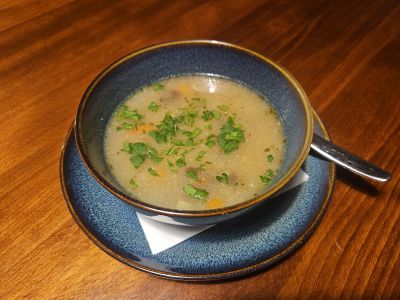 Kapustová polévka, 150g KRÁLIČÍ jatýrka smažená v PANKO japonské strouhance, bramborový salát s majonézou