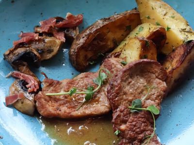 500g živáňská pečeně, plec se slaninou, klobásou a zeleninou pečené spolu s bramborem + pečivo