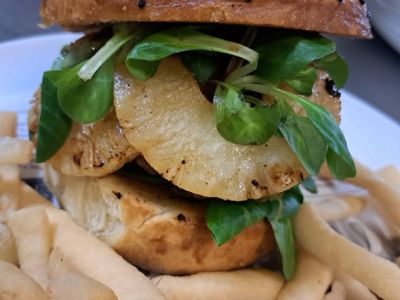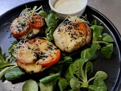 Tip šéfkuchaře: 300g Svěží zeleninový salátek s grilovanými prsíčky, mozzarellou, jogurtovým dressingem a opečeným toastem. NOVINKA: místo kuřecích prsíček je možno dát sýrové nugetky (z nivy a goudy) nebo kuřecí řízečky