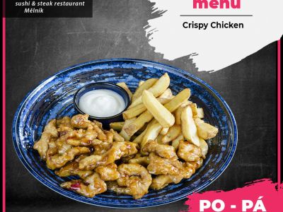 Pečené kuřecí paličky, smažené hranolky, česnekový dip.