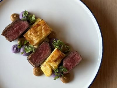 Grilovaný hermelín, bramborové pyré s brusinkami, cibulová marmeláda