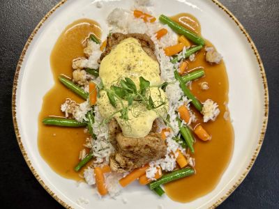 Smažené krůtí řízečky marinované v bylinkovém pestu, bramborová kaše, ovocný kompot