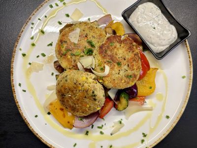 Miska zdraví: tilápie sous vide, bylinkové máslo, batátové pyré, grilovaná zelenina, kopr fresh, salátek