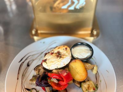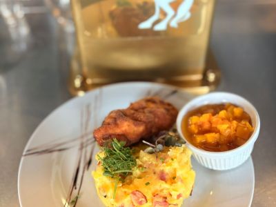 “Tajemství paní Podhorské” - zapečený kuřecí steak s broskví a sýrem, belgické hranolky, domácí tatarská omáčka