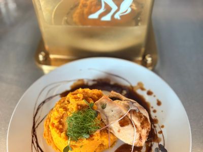 Filírovaná vepřová panenka na grilované zelenině se žampióny, pečené grenaille s bylinkami