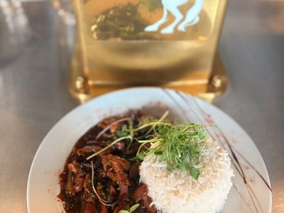 100g Hovězí kostky na majoránce, rýže dušená 200g 169
