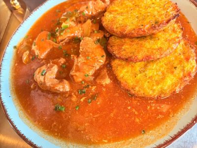 150g Hovězí krk pomalu dušený s rajskou omáčkou s perníkem a houskovým knedlíkem