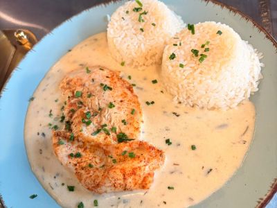 Grilovaný kuřecí steak zapečený s hermelínem, hranolky - rýže