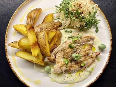150g Kuřecí přírodní kapsa s tradiční nádivkou, šťouchanými brambory a tatarskou omáčkou