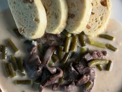 150 g hovězí v koprové omáčce sesazeným vejcem, pečené grenaille