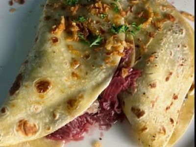 Huso-kachní stehno plněné šunkovým zelím, podávané s jihočeským drbákem, zalévané karamelizovaným výpekem 1312