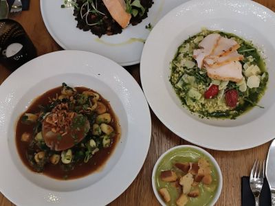 120/250g Tarhoňové rizoto se smetanovou omáčkou, listovým špenátem a brokolicí, natenko krájené krůtí prso, parmezán, rukola (1,3,9,11)