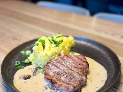 Grilovaná vepřová krkovice Duroc, mačkané brambory s jarní cibulkou, hříbková omáčka