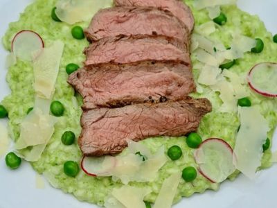 Hovězí roštěná s vídeňskou cibulkou, dušená rýže