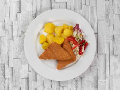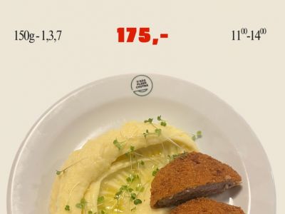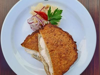 120g Gordon Bleu (prso, šunka, sýr, trojobal), brambory s máslem[1, 3, 7]