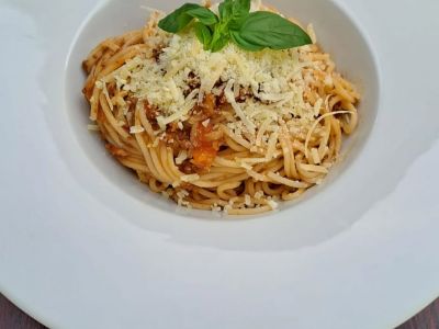 Spaghetti con Polpette (Spaghetti v krémové rajčatové omáčce s masovými koulemi, parmazán)