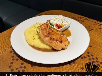 200g Kuřecí prsíčko sous-vide s pošírovanou brokolicí, kroketami a sýrovým přelivem 137