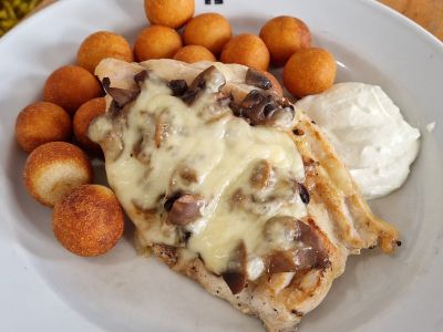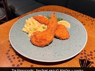 SPECIALITA DNE: Kuřecí řízek v paprikovo-sýrovém těstíčku s bramborovou kaší a naší tatarskou omáčkou [1, 3, 7, 10, 12]