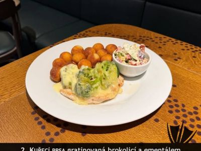 150g Kuřecí prso s prosciuttem, šalvějí, jemnou vinnou omáčkou a gratinovanými brambory