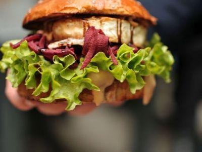 Meat beer burger – v máslové housce zapečený se sýrem raclette, s karamelizovanou cibulí, lanýžovou majonézou, nakládanými okurkami a cibulí