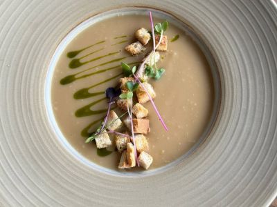 Zvýhodněné menu Lososová polévka, bylinky * Vepřová panenka, pistácie, brambory, bylinky * Denní dezert