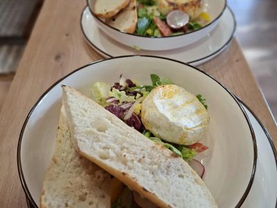 Hermelín na grilu 1 ks, cibulková marmeláda, míchaný salát, domácí focaccia 1712