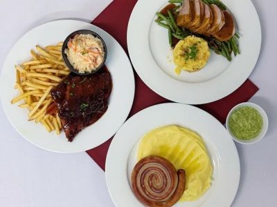 150g Marinovaná vepřová krkovička, americké brambory, obloha 1, 7)