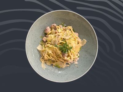 150 g Vepřová panenka na zeleném pepři a smetaně, tagliatelle