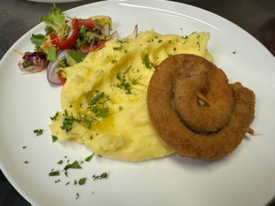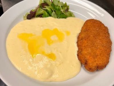 150g Kuřecí Cordon Bleu servírovaný s bramborovou kaší A:1, 3, 7
