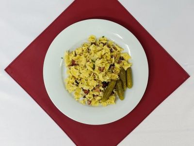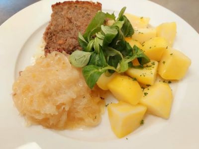 150g Kapustový karbanátek s bramborovou kaší a okurkou