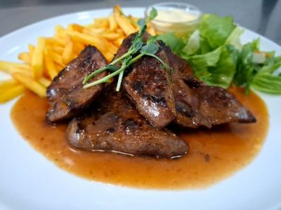 150g Vepřový steak gratinovaný se sýrem a vejcem, restované bramborové plátky