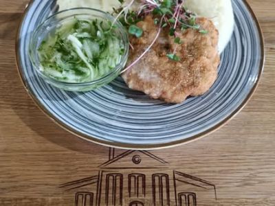 Holandský řízek, šťouchané brambory s cibulkou, kyselá okurka