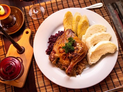 Pečené kachní stehno, červené zelí, bramborový knedlík