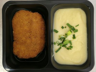 Smažené řízky z vepřové panenky v panko strouhance s okurkovým salátem, bramborová kaše