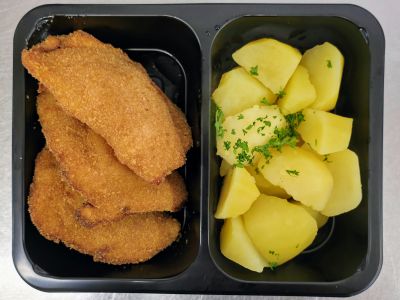 DOMÁCÍ SEKANÁ PEČENĚ se šťouchaným bramborem, kompot 137