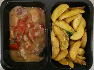 • 150g ROZMARNÉ BRAMBORY (pečené půlky brambor s kuřecími nudličkami se zeleninou, česnekový dip)