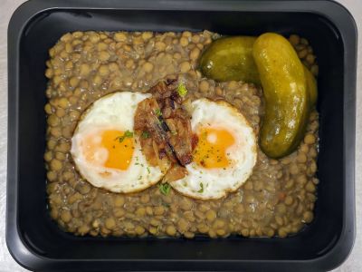 2ks sázené vejce, čočka na kyselo, okurek, cibulka, chleba