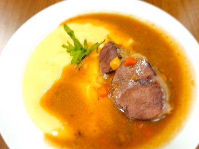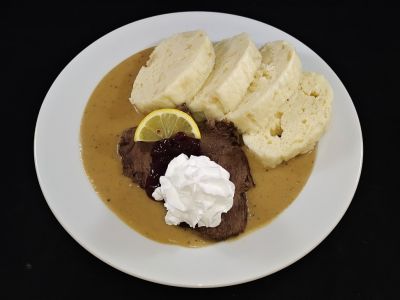100g Hovězí pečeně po myslivecku, houskové knedlíky /1, 3, 7, 9, 10/