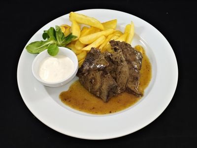 200g smažená vepřová játra, hranolky, tatarská omáčka