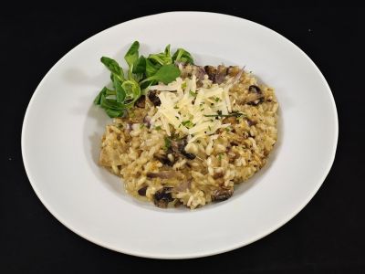 Filírovaná kuřecí prsa na krémovém rizotu s červenou řepou sypaná italským sýrem
