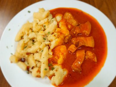Segedínský guláš speciál. Pravý Segedínský guláš z křehkých kousků vepřového masa. Maso dušené do měkka s kysaným zelím a bohatou paprikovou omáčkou zjemněnou smetanou. Klasická, hustá a sytá chuť. Podáváme s domácími houskovými knedlíky.
