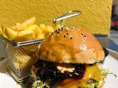 150g BBQ trhaný vepřový burger, sýr polníček, rajče, salát Coleslaw, tenké hranolky