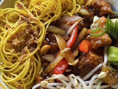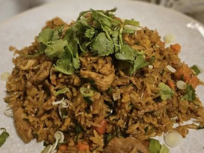 150 g Kuřecí steak, medovo-hořčičná omáčka, dušená rýže